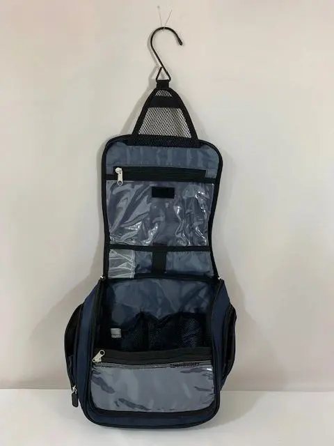 Hanging Toiletry Bag, approximately 10″h x 9.5″w x 4″d with: Two see-through pockets to view contents Side zippered pockets for tall containers Center section with dedicated organization slip pockets Hang-anywhere hook and web handle Exterior zippered pockets for storage